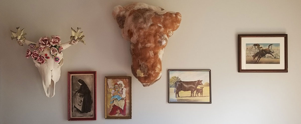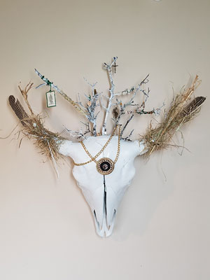 Bison skull, religious ephemera, owl feathers, locust branches, burlap, wire, enamel