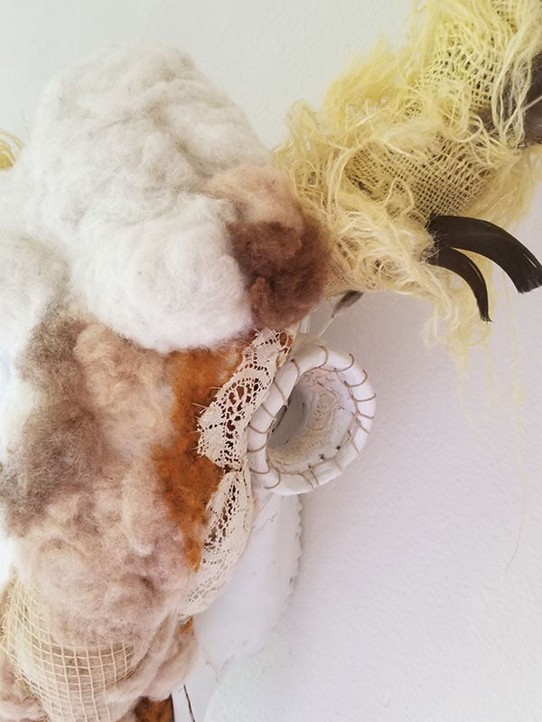 Bison skull, recycled plastic bags, recycled poly fiberfill, jute, twine and cotton poly thread, burlap, raw sheepskin, produce netting, felted wool "Queenie"