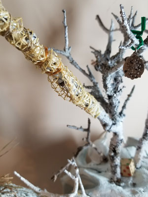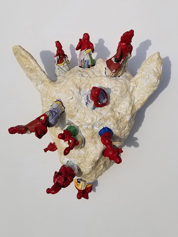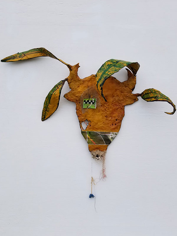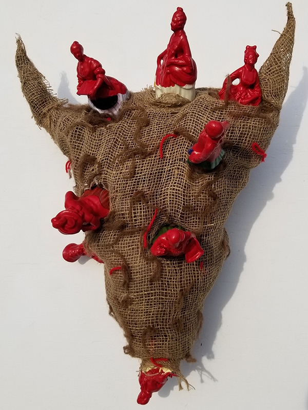 Metal frame, galvanized wire, cotton string, recycled canvas, burlap, washi tape, paper mache, clay, embroidery thread, found objects, acrylic