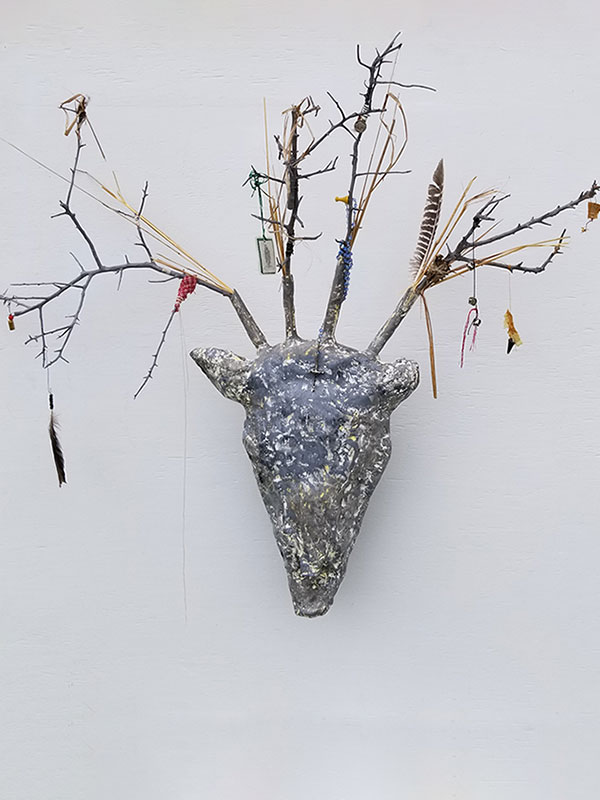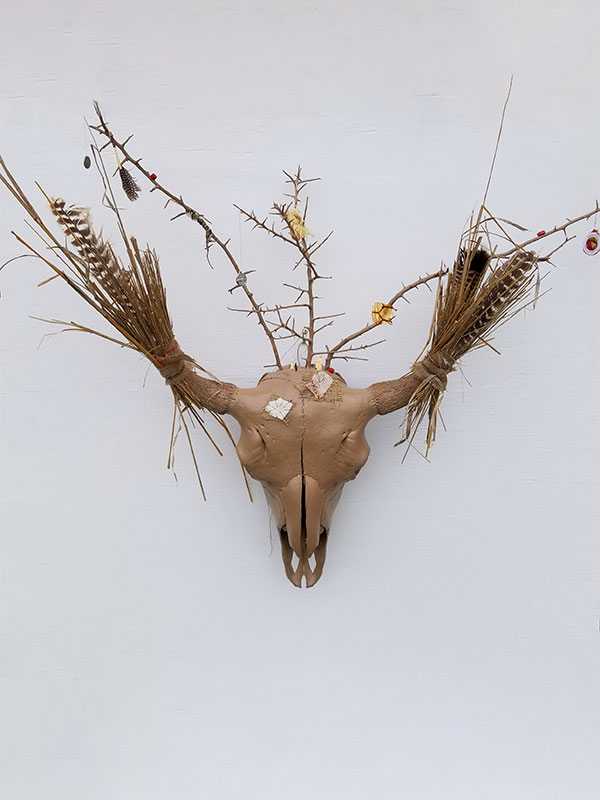 Bison skull clay cast, locust branches, wire, feathers, deer spur, ephemera, thread