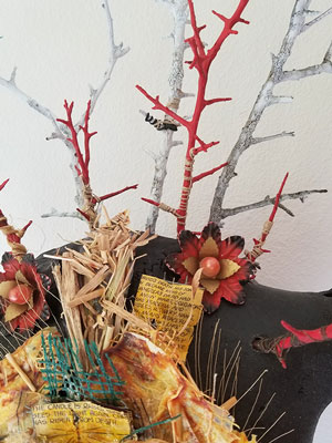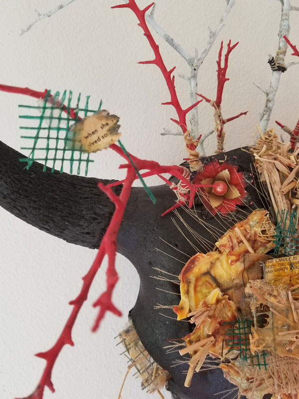 Bison skull, wire, thread, twine, jute, straw, religious ephemera, found objects, guinea fowl feathers, black locust branches