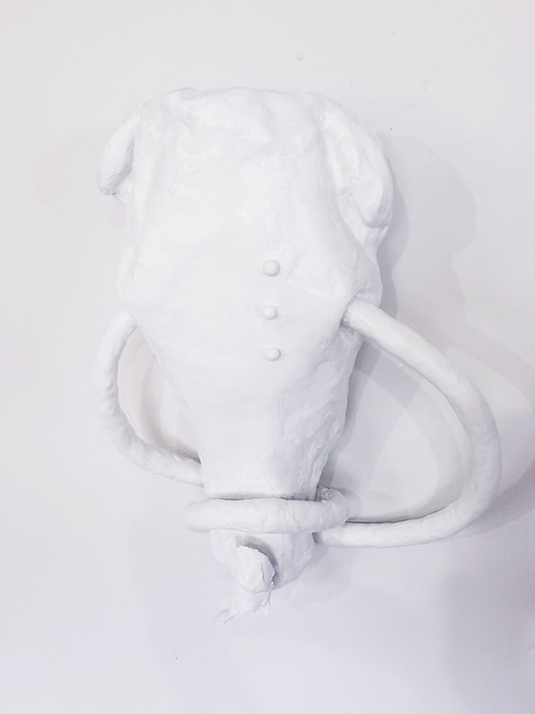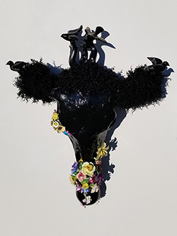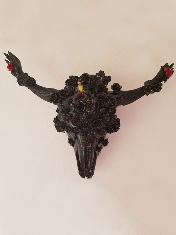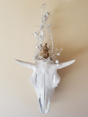 Bison skull, paper mache, polystyrene, wire, found objects, thread, enamel