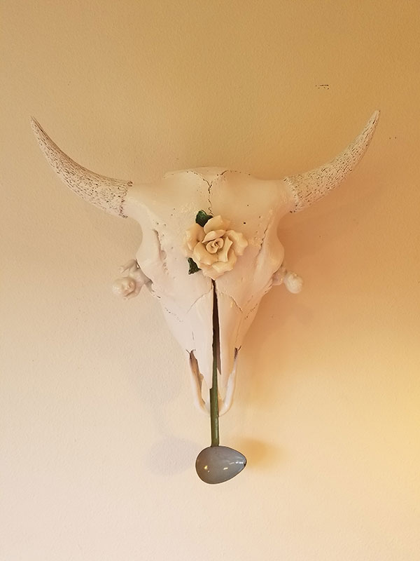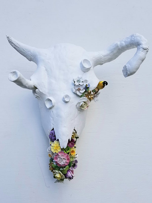 Bison skull, found metal and ceramic, enamel paint, epoxy
