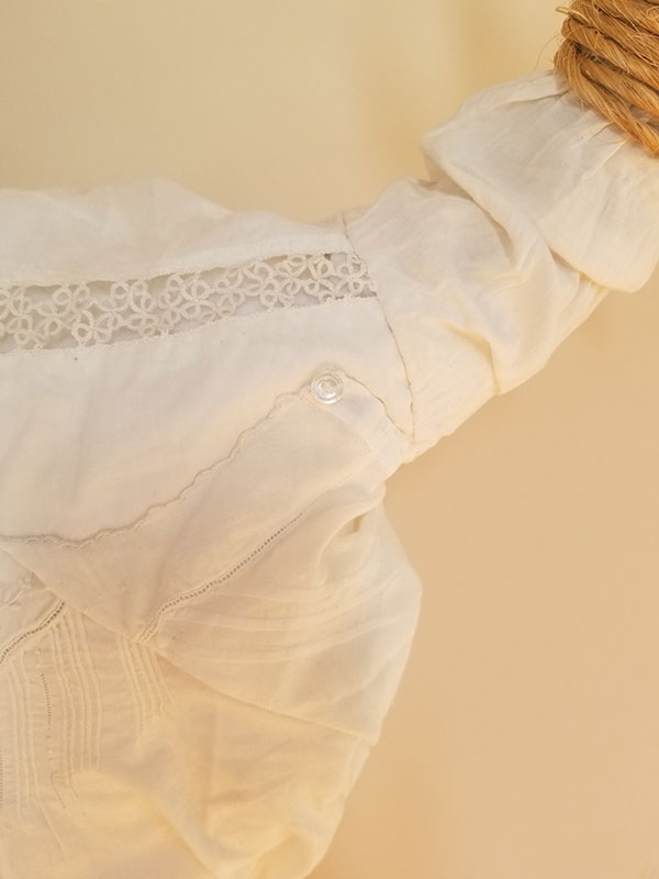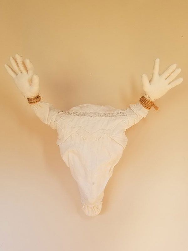 Bison skull epoxy, vintage gloves and child's dress, baler twine, poly fiberfill, felt and galvanized wire