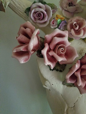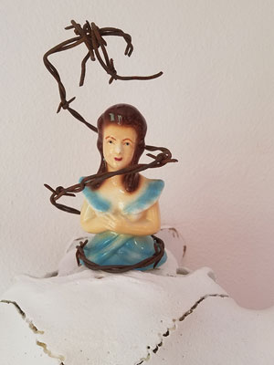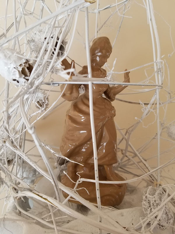 Bison skull, invasive plant vine, bone china figurine, wire fencing, twine, epoxy