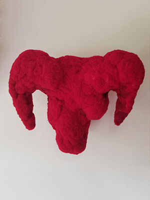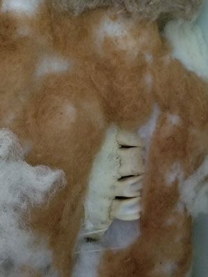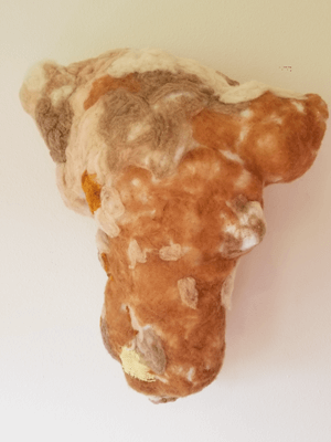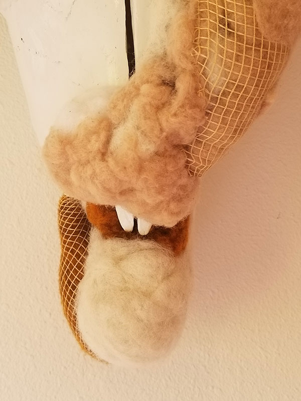 Bison skull, galvanized steel wire, recycled poly fiberfill, jute, twine and quilters thread, produce netting, acid-dye felted wool