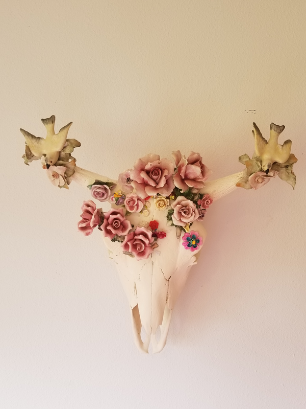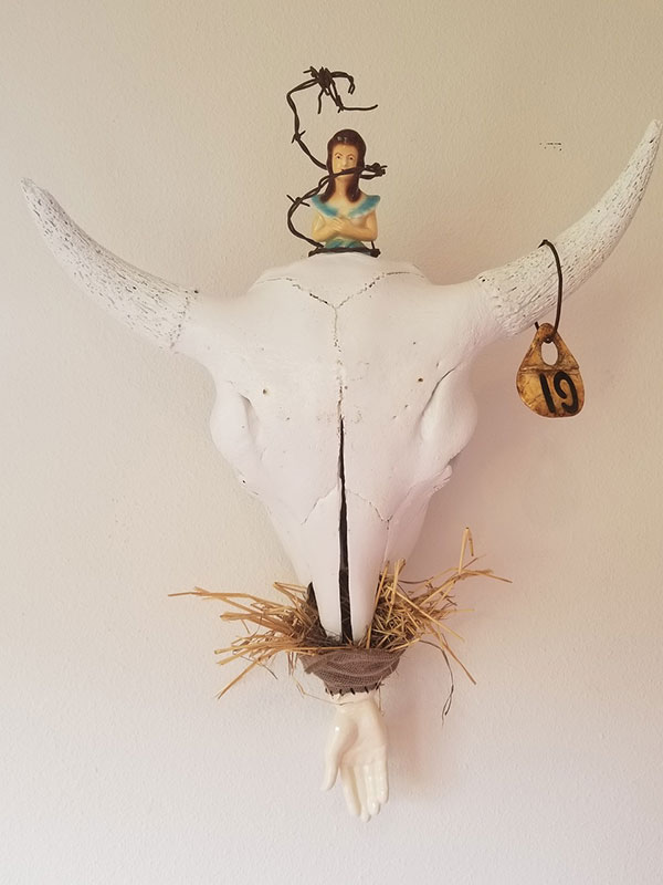 Bison skull, clay, found objects, acrylic medium