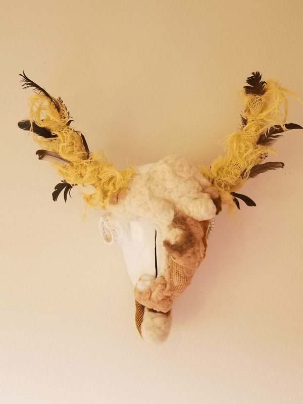Bison skull, recycled plastic bags, poly fiberfill, jute, twine, cotton/poly thread, produce netting, felted wool"Queenie"