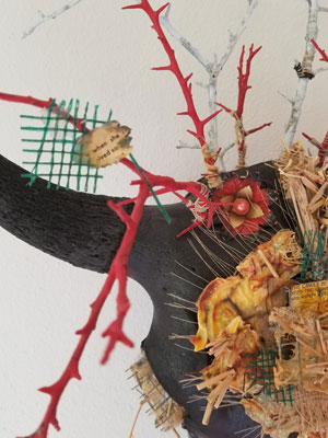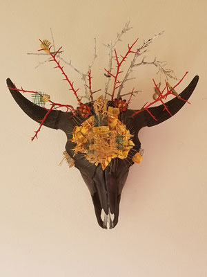 Bison skull , epoxy resin, thorn tree branches, found objects, jute, baler twine, cotton/poly thread