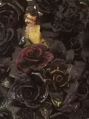 Bison skull, polyurethane, bone china figurines, epoxy